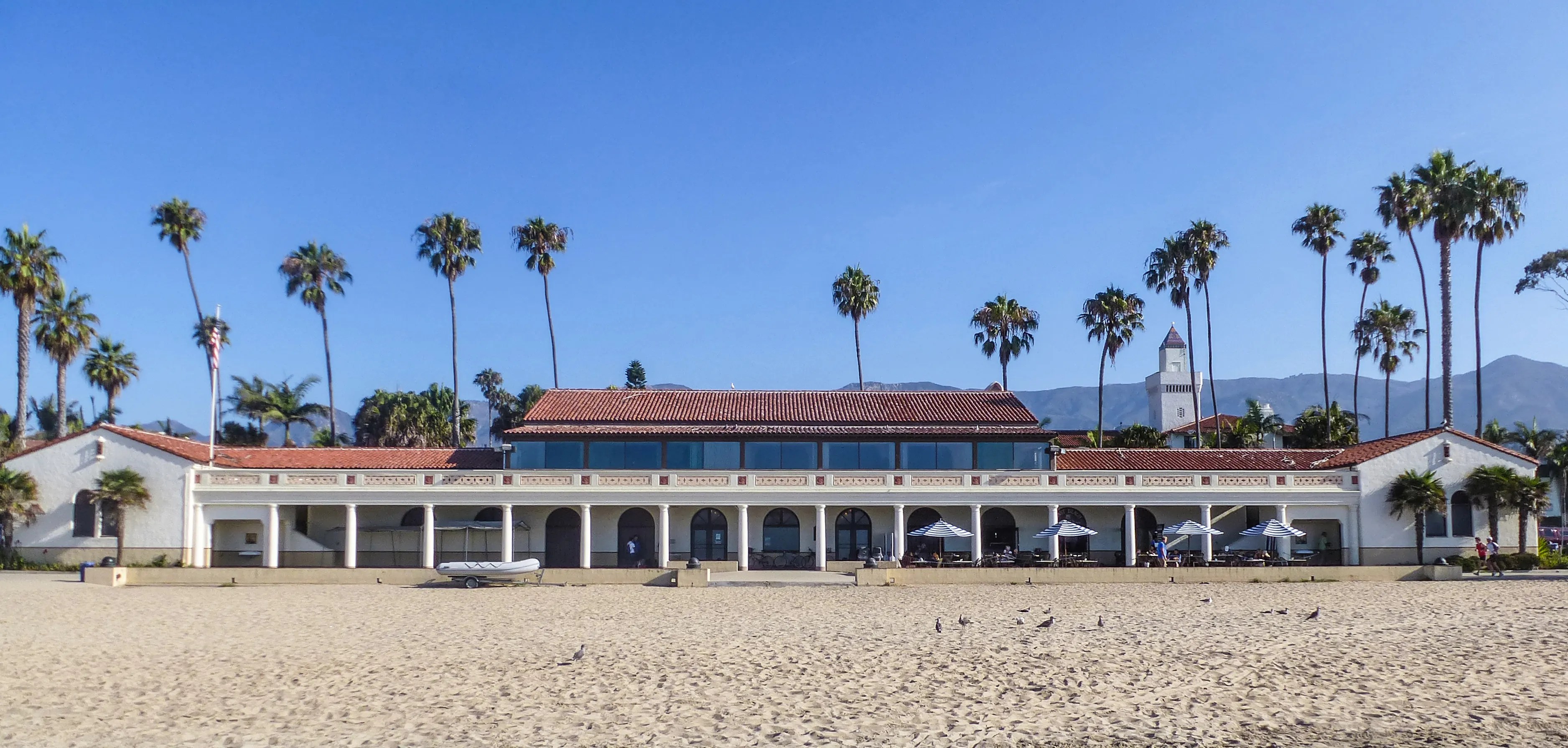on the beach in front of the Cabrillo Pavilion. When wedding/event reservations occupy the space, we move slightly west (in front of the E. Cabrillo Parking Lot).